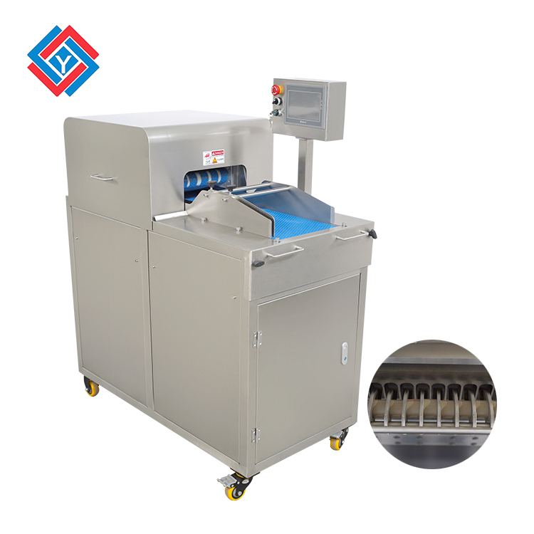 這款切肉丁機整體采用了不銹鋼制作,機身鋼板厚度達到了3mm,表面使用了拋光拉絲處理工藝,優化衛生方便清洗,切肉丁機的刀片是不銹鋼材質,特別淬火加工過后,可用鋒利的刀片將鮮肉開條再切塊,切割紅殺肉塊的肉丁迅速且大小均勻,機身同時還采用了快拆式刀組,方便更換加工其他肉類,省去了大量的人工成本。