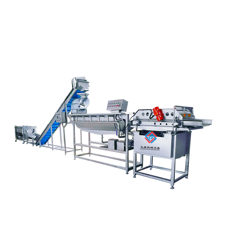 蔬菜清洗加工生產線前道工序可以將原料輸送至切菜機,之后通過切菜機進行物料的加工,通過進入皮帶提升機,再通過提升機將物料輸送至水流清洗機進行清洗,水流會通過輸送帶將產品傳送至振動瀝水機進行去渣工作,之后再進入二次水流清洗機用流水進行清洗,0-5度的冷水能夠保證蔬菜的質量、口感、成色以及儲存周期的特點,之后通過二次振動瀝水機進行濾水除渣,就能夠完成蔬菜前期的處理工作。