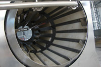由電機(jī)帶動中間軸上的鏈輪旋轉(zhuǎn)從而帶動滾筒的旋轉(zhuǎn),滾筒上有三個大法蘭,由六個托輪支撐,滾筒速度可由電機(jī)作調(diào)整。滾筒內(nèi)壁裝有導(dǎo)料長條,滾筒內(nèi)有噴淋水管,下方有兩個水箱,進(jìn)料方噴淋管的水來自出料邊水箱,此水采用循環(huán)水;出料處的噴淋水來自進(jìn)料邊的水箱,此水是清水。